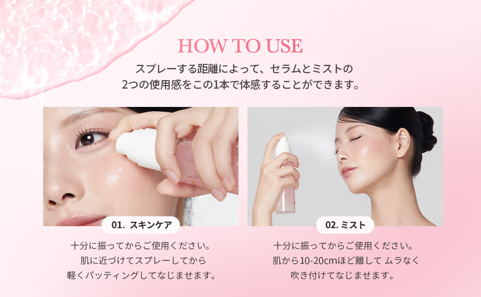 押さえておきたいポイントとして、ピンクセラムミストは肌に近づけて使うとジェル状の美容液として使えて、離して使うと、ミストとして使用できる点です!